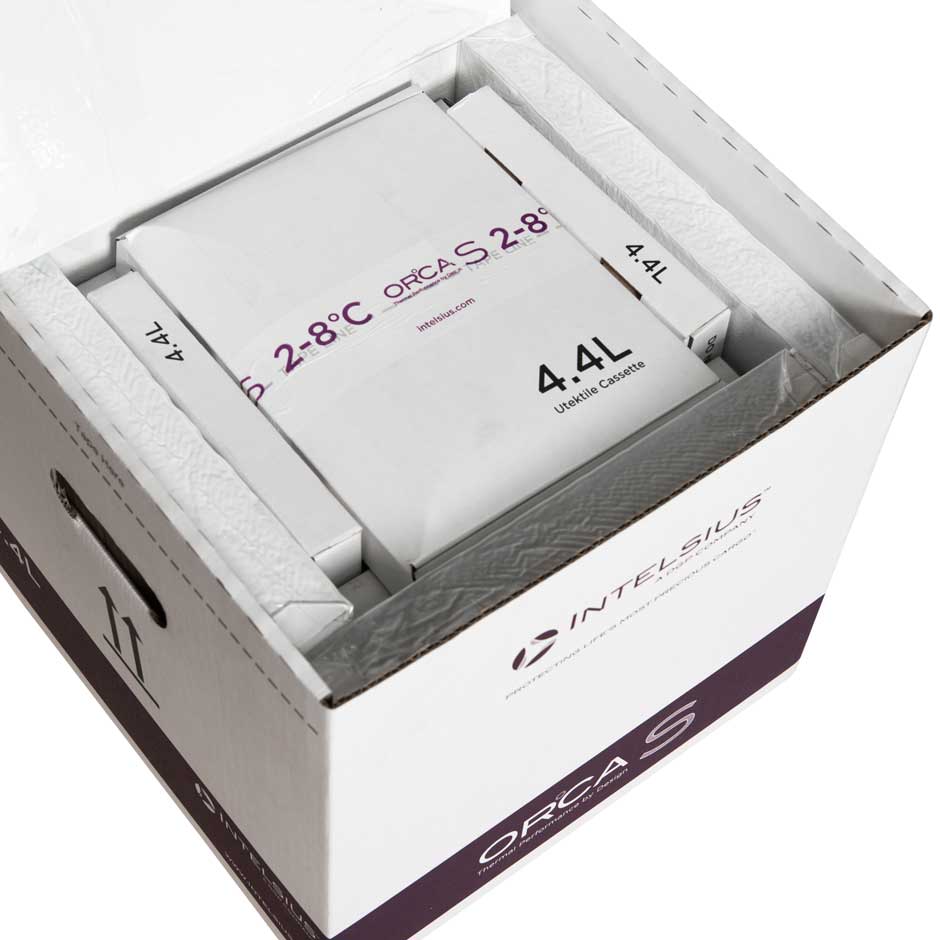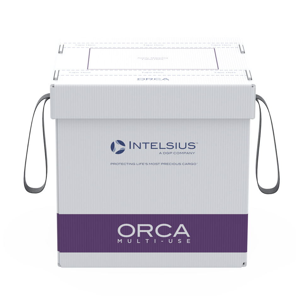 Intelsius bietet auch vernetzte, temperaturgesteuerte Verpackungslösungen mit integriertem Datenlogger an, mit dem Sie die Innen- und Außentemperaturen sowie den GPS-Standort verfolgen können. Für eine zusätzliche Überwachung Ihrer Ladung während des Transports empfehlen wir vernetzte Lösungen wie unser ORCA Connect-System.