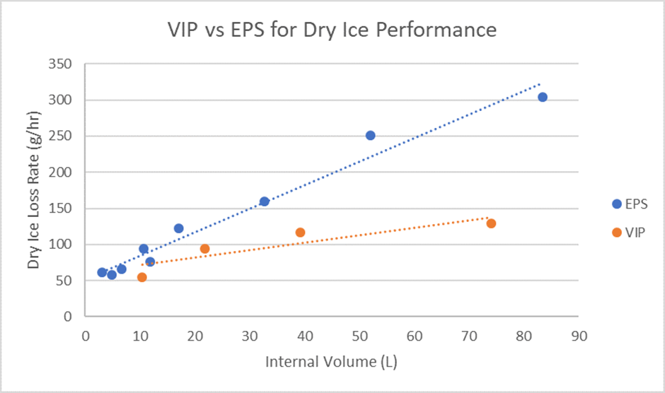 Das folgende Diagramm zeigt, wie die VIP-Dämmung im Vergleich zu EPS abschneidet, wenn beide Materialien bei Verwendung von Trockeneis als Kühlmittel verglichen werden.
